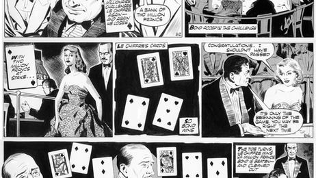 artist, who previously worked for Air Force Bomber Command in World War II, was asked to supply a sample comic strip of what James Bond would look like before he won the contract for the strip series. He chose to illustrate a scene from "From Russia With Love" in which Bond and Red Grant fight on the Orient Express. Fleming approved of the sample and, shortly afterwards, the first publicity material began to appear from the Daily Express, announcing the start of Casino Royale. Initially sticking closely to Fleming's source material, the strips created by Hearne and McLusky were an instant success and boosted sales of the newspaper. Fleming's concerns were eased when the flow of the stories, although only read at a rate of three cells a day, kept readers hooked despite losing a lot of Fleming's detailed prose from the original material. The punchy, fast-paced style and daily "cliff-hangers" suited Bond's adventures perfectly.